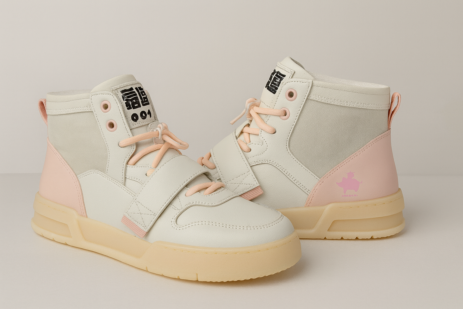 Let her step out in style with these cream and pink high-top sneakers, made especially for girls who love fashion and comfort. Designed with a modern streetwear look, these sneakers feature a soft cream upper with pastel pink accents, lace-up front, and a Velcro strap for easy wear and a secure fit.