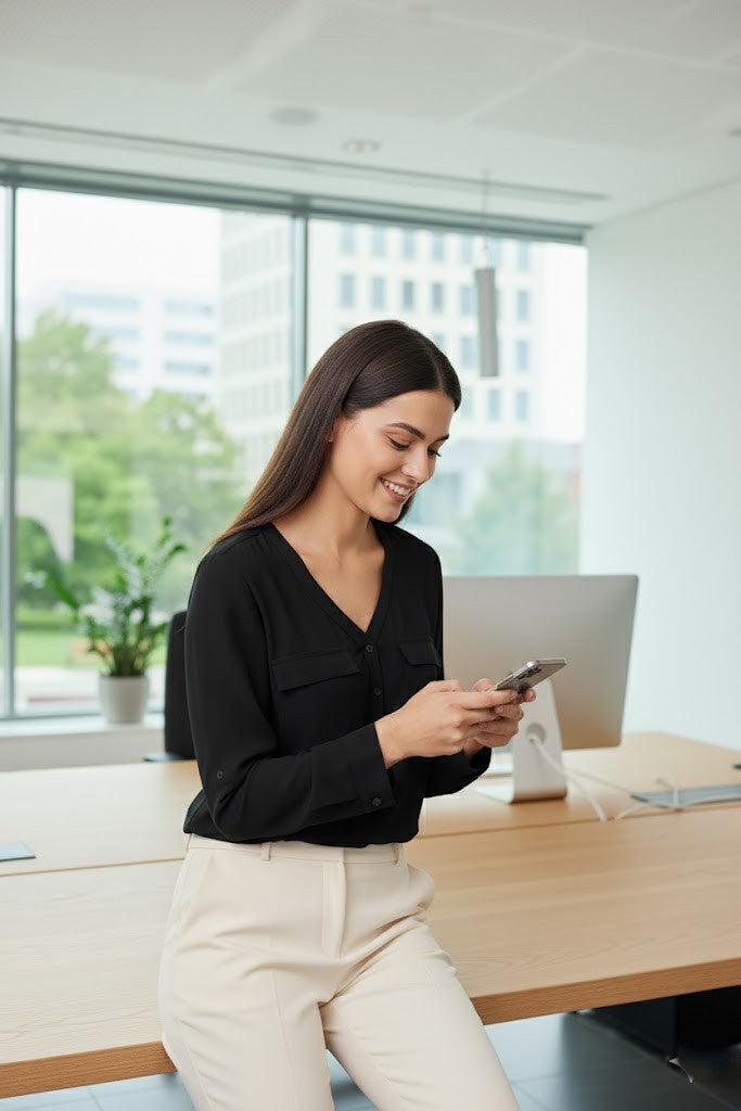 Elegance meets comfort in this Long Sleeve Blouse, designed with a soft V-neckline and front flap pockets for a refined yet casual look. Made from a lightweight, smooth fabric, it drapes beautifully and feels airy against the skin — perfect for work, casual outings, or layering under a blazer.